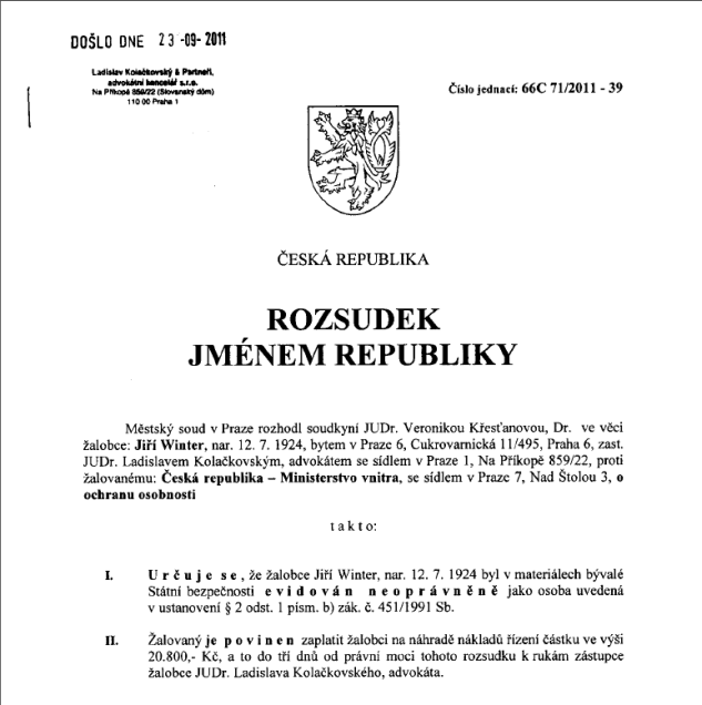 Celou záležitost jsme tedy dali k soudu. A výsledek? Jiří Winter byl v materiálech bývalé Státní bezpečnosti